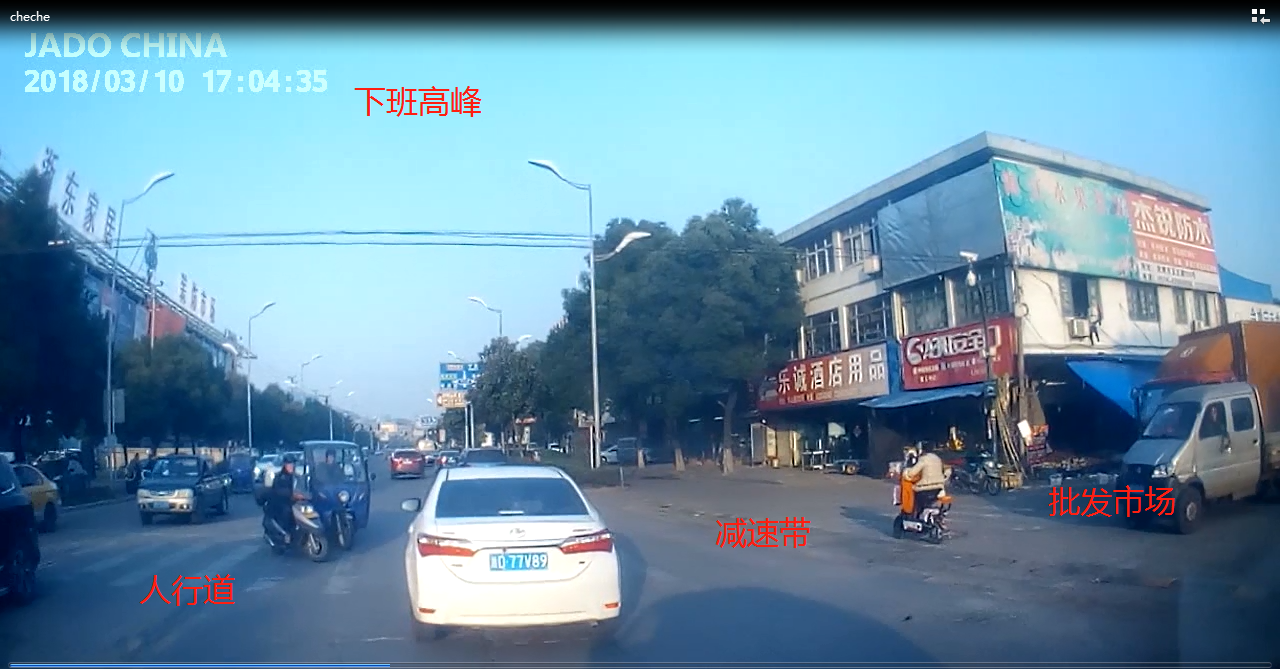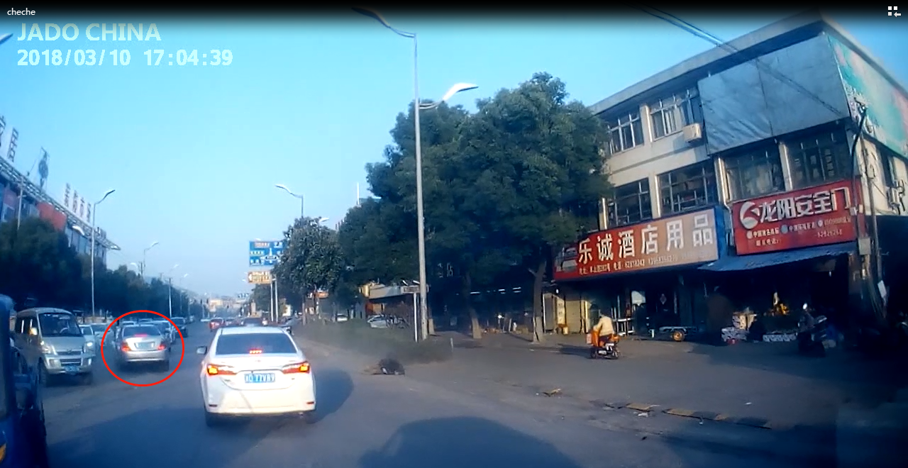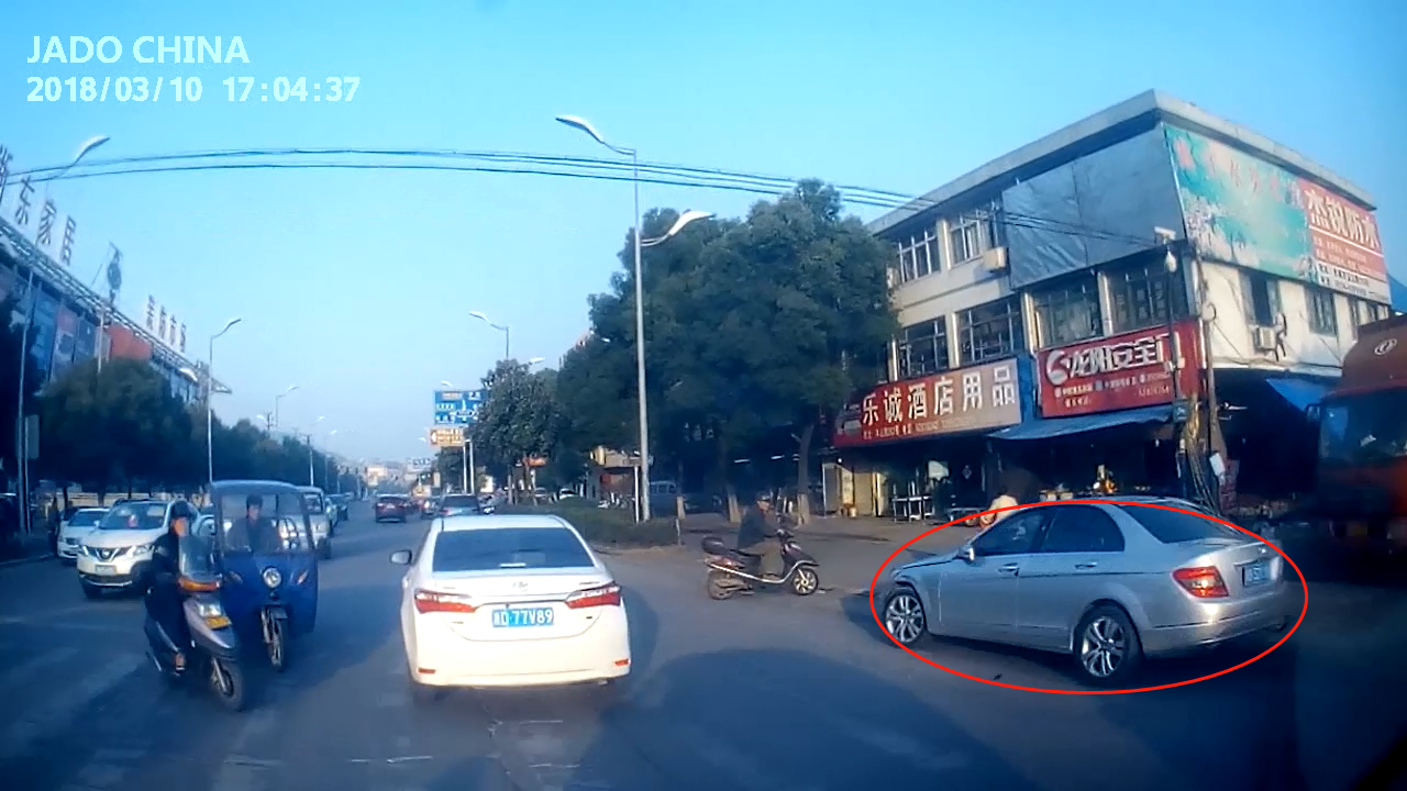 視頻中顯示,一輛銀色汽車迅速地撞向前方橫穿馬路的電瓶車,在急打左轉向盤的時候,沖向反向車道又撞上一輛面包車,造成二次傷害,整個過程被捷渡車主安裝的D720行車記錄儀記錄了下來。