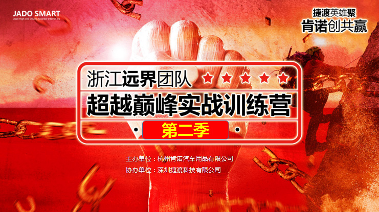 2017年9月12日,杭州肯諾汽車用品有限公司攜手JADO捷渡智能(中國),舉行了“捷渡英雄聚,肯諾創(chuàng)共贏”浙江遠(yuǎn)界團(tuán)隊超越巔峰實戰(zhàn)訓(xùn)練營PK賽總結(jié)大會。JADO捷渡智能(中國)華東戰(zhàn)區(qū)總監(jiān)杜新先生、杭州肯諾汽車用品有限公司總經(jīng)理徐善振先生,以及各優(yōu)秀終端門店店長參加了本次總結(jié)會。