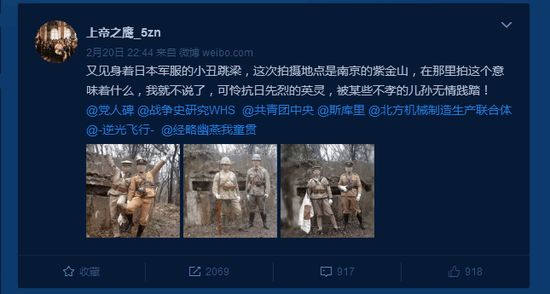 近日,有兩名青年身穿侵華日軍軍裝在南京紫金山抗戰遺址留影,并上傳網絡。2月20日,大年初五,網友@上帝之鷹_5zn 在微博發出了一組照片揭露此事。