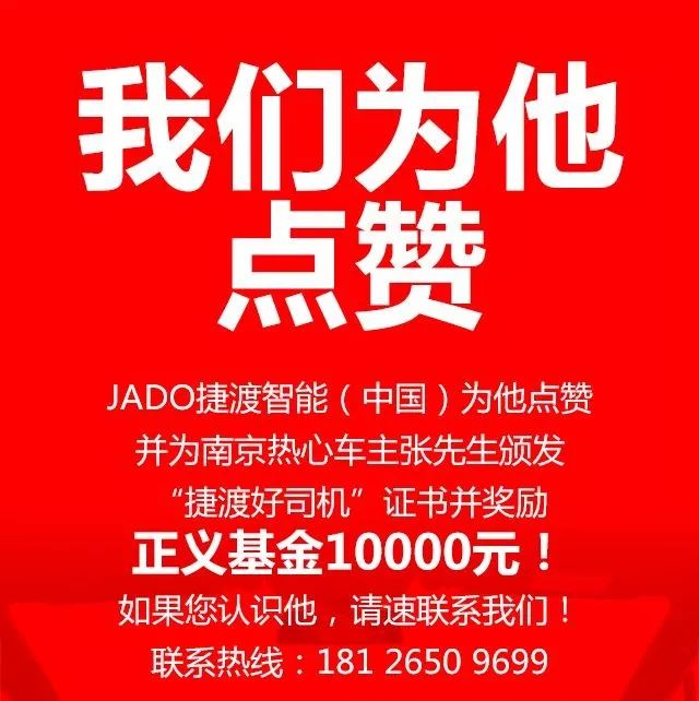 JADO捷渡智能(中國)為提供證據的張先生點贊,為他的中國心、正義感點贊!同時將為張先生頒布“捷渡好司機”證書,并獎勵正義基金1萬元!
