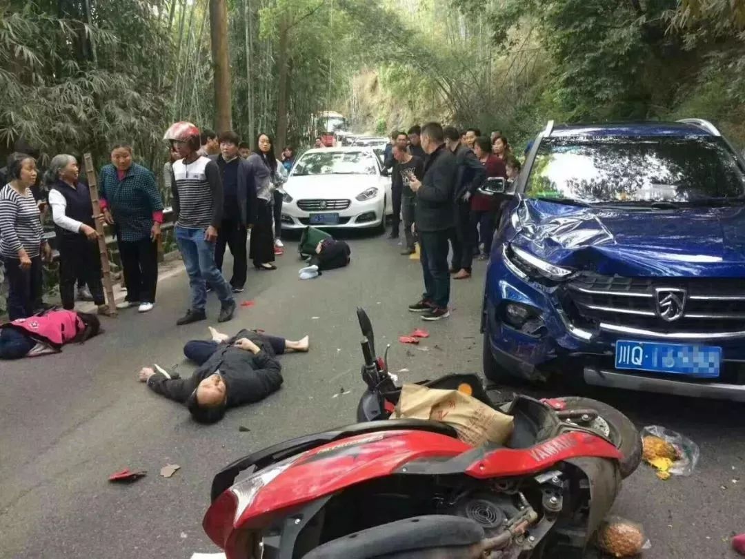 據(jù)視頻上的行車記錄儀顯示,事發(fā)路段車流量較大,路面平坦但彎道較多。畫面中一輛搭載三人的兩輪摩托車行駛在安裝有行車記錄儀的汽車前方。當(dāng)摩托車行駛至一塊寫有“三中隊(duì)”的交通指示牌下, 對(duì)面一輛藍(lán)色寶駿汽車(車牌川Q169**)突然越過中間線超車,與摩托車發(fā)生猛烈撞擊,摩托車上三名駕乘人員當(dāng)即飛出,摔在公路上。