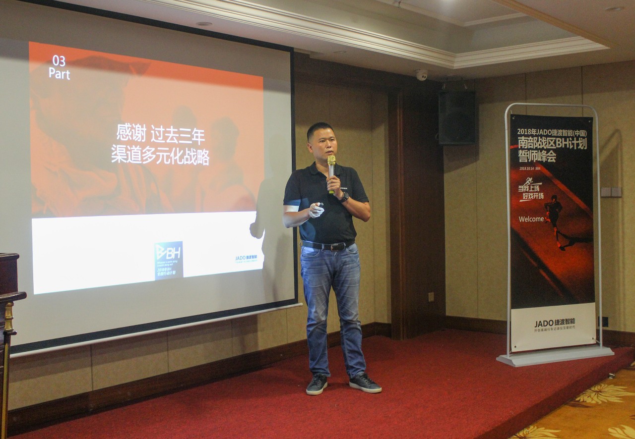 2018年10月14日、18日,JADO捷渡智能(中國)分別在中國·深圳、合肥兩地舉行了主題為“當我上場,好戲開場”的2018年度JADO捷渡智能(中國)南部、北部戰區決勝終端誓師峰會。到場嘉賓有:JADO捷渡智能(中國)董事長王杰先生、營銷中心總經理陳問文先生、營銷中心副總經理劉赟先生以及來自全國的戰略合作伙伴超過100人。